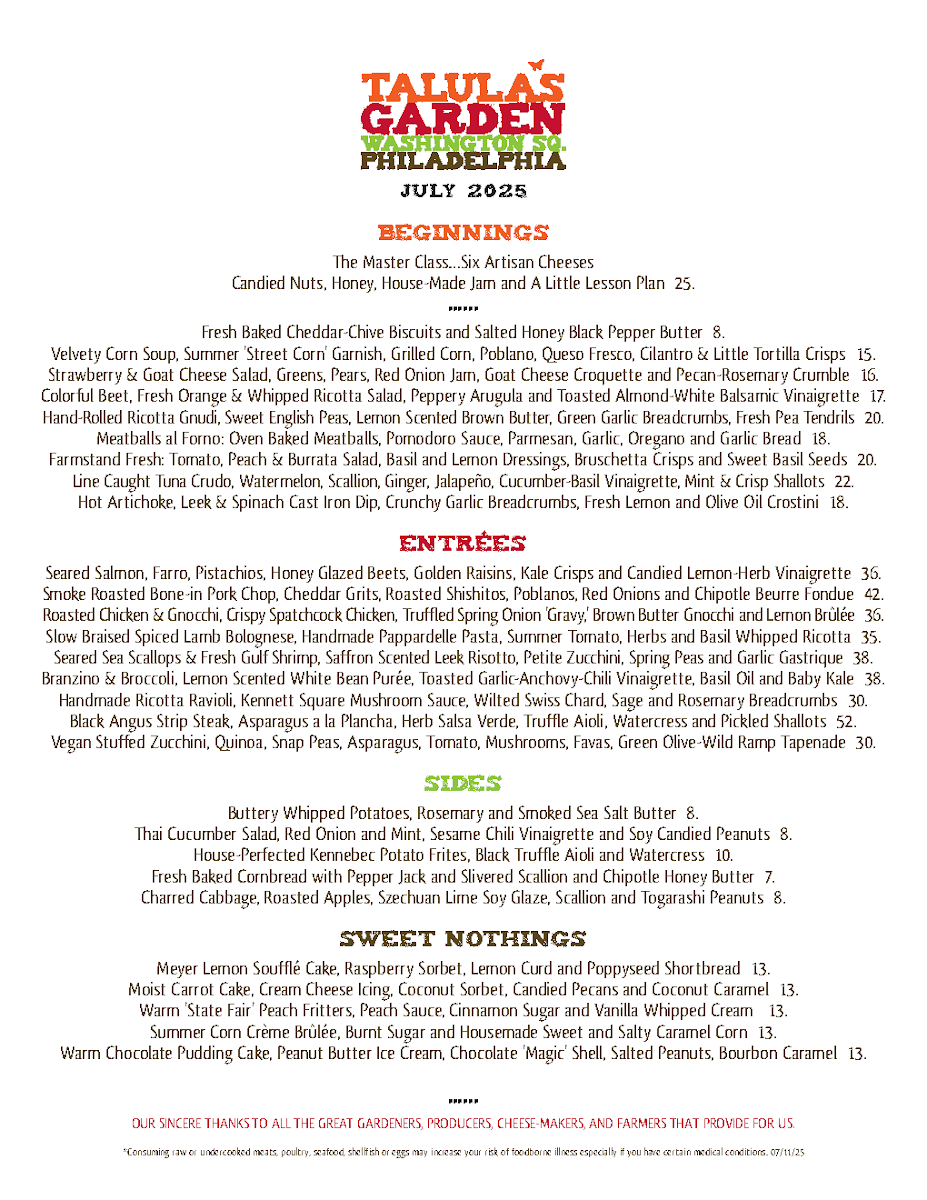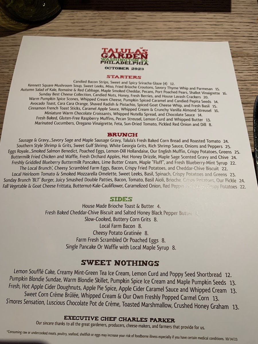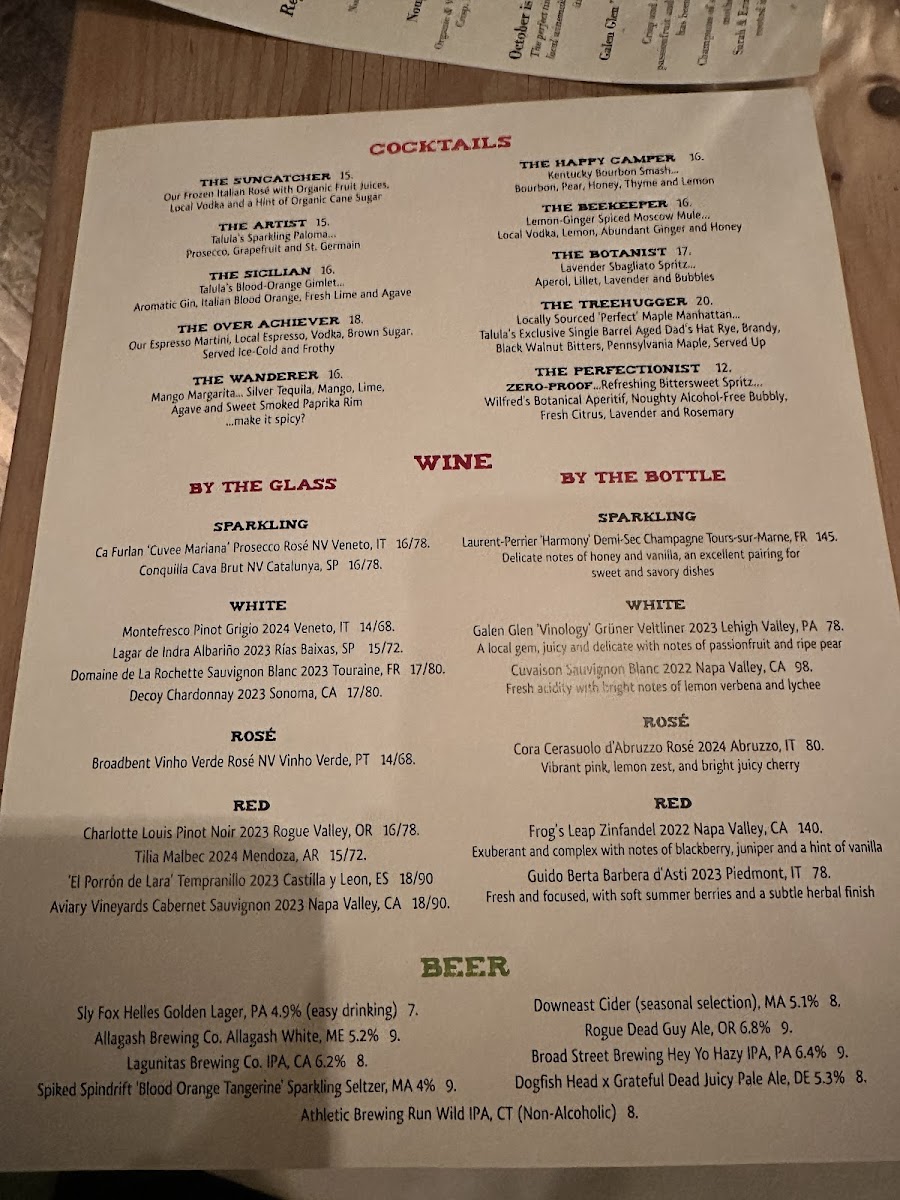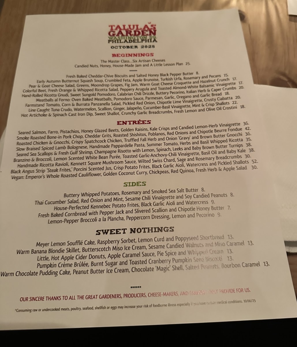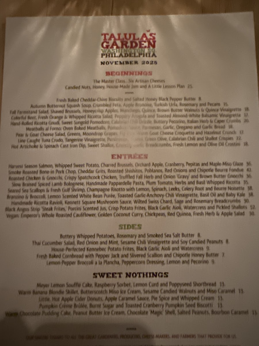 This menu fits well with the overall ambiance—a blend of casual energy and thoughtful detail. It invites visitors to savor each moment, whether catching up with friends over avocado toast or winding down with a dessert like the Meyer Lemon Soufflé Cake. The food and drinks reflect the attentive service and relaxed conviviality that make dining at Talula’s Garden feel like an enjoyable everyday occasion.