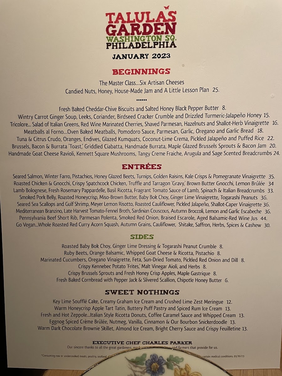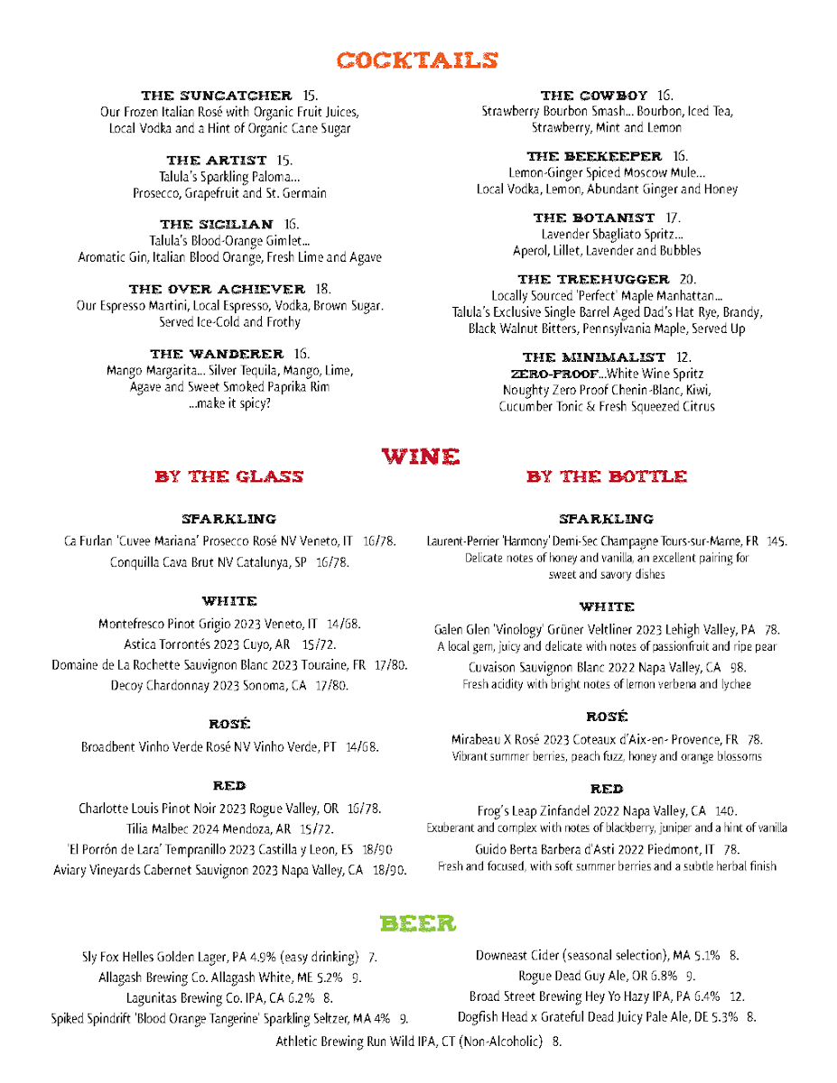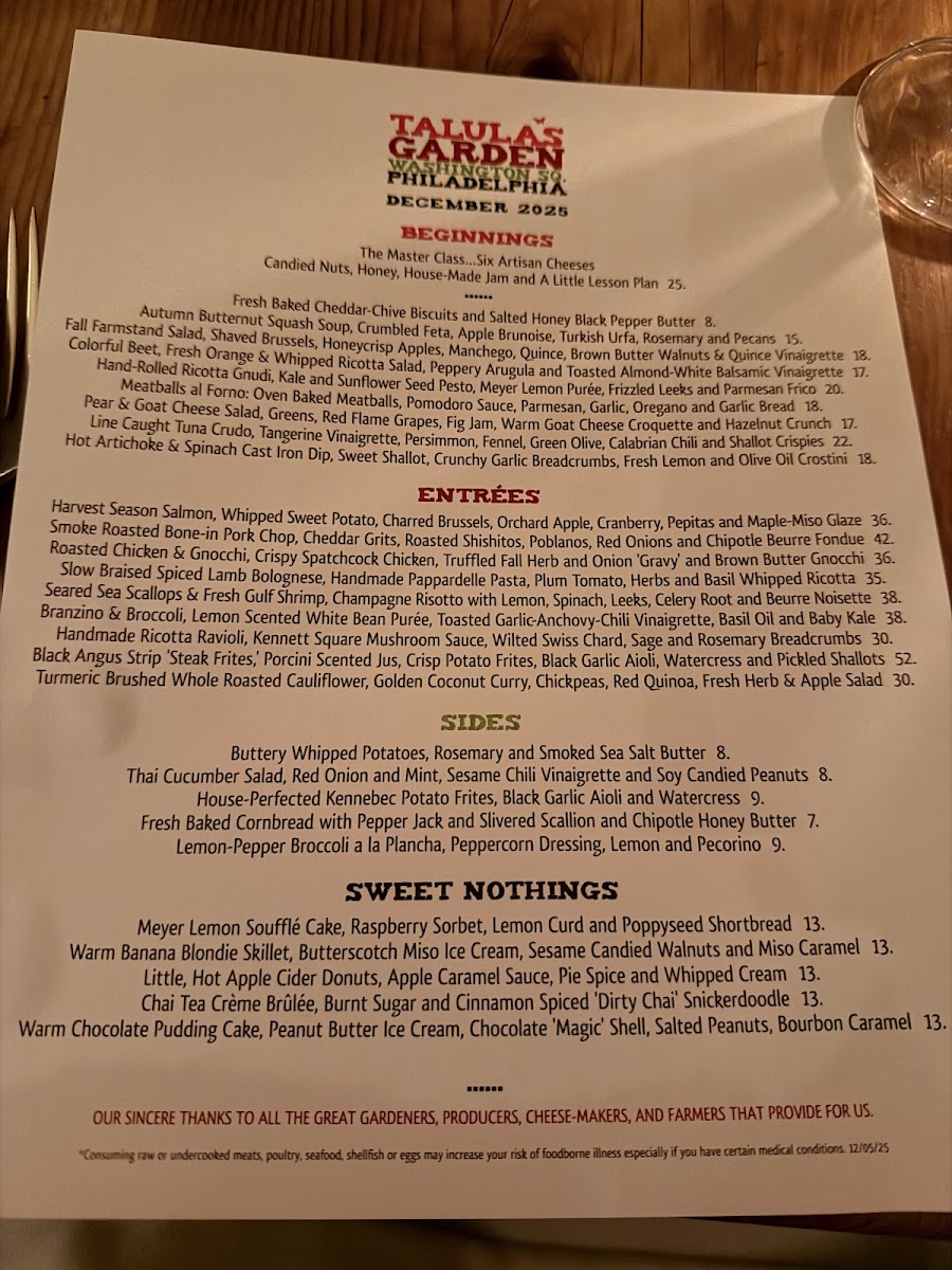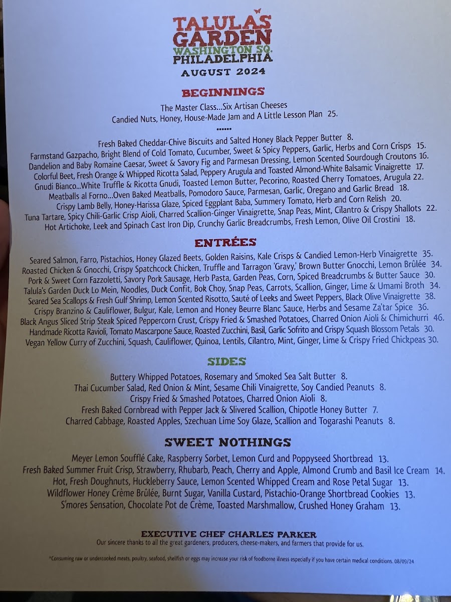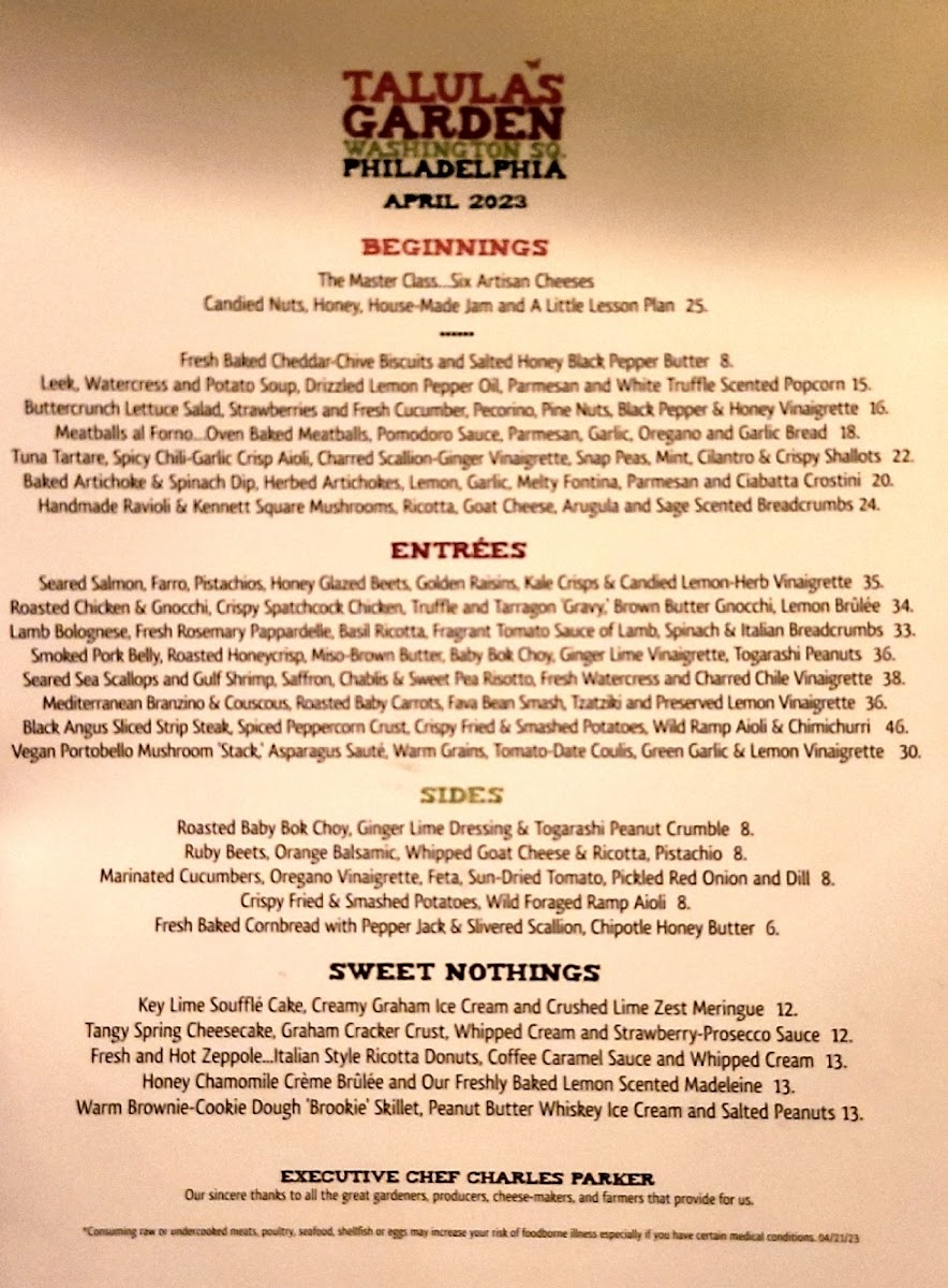 This menu fits well with the overall ambiance—a blend of casual energy and thoughtful detail. It invites visitors to savor each moment, whether catching up with friends over avocado toast or winding down with a dessert like the Meyer Lemon Soufflé Cake. The food and drinks reflect the attentive service and relaxed conviviality that make dining at Talula’s Garden feel like an enjoyable everyday occasion.